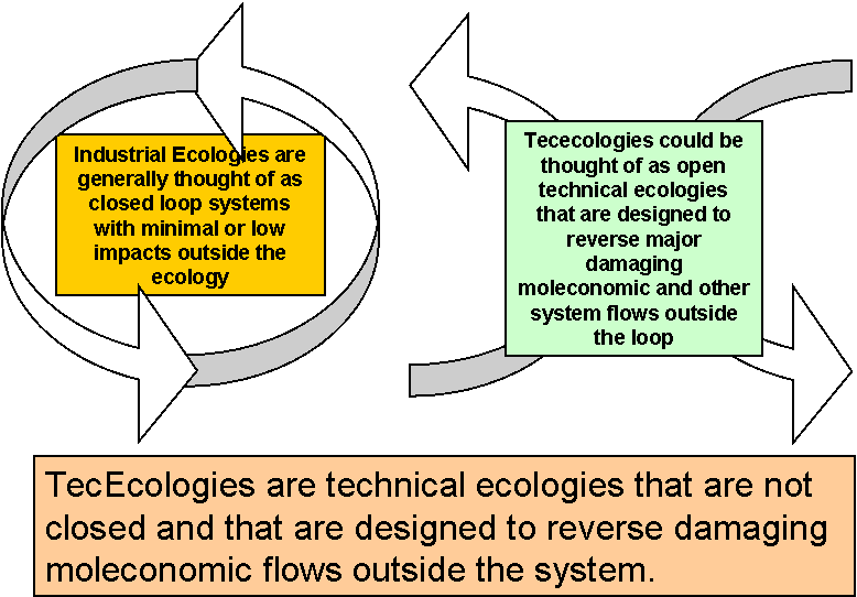 Tececologies are different to industrial ecologies because they are deliberately designed to economically reverse damaging moleconomic flows outside what were generally thought of as closed industrial systems. They go much beyond what the concept of an industrial ecology embraces and could be likened to ecological pumps. Industrial ecologies recycle but do not reverse flows outside what could be considered as a closed system with a flow greater than required for their own inputs.