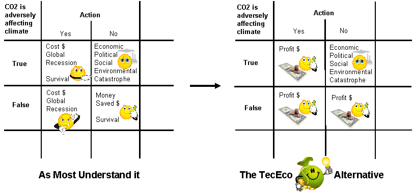 Game theory teaches us that if there were no negative or recessive consequences of taking action the decision for our leaders becomes much easier because regardless to whether CO2 is causing global warming or even whether global warming is actually happening, it becomes the only logical course of action. Our leaders will take action to minimise undesirable consequences even with a low probability that the science is false. The TecEco solution is to recycle CO2 in the atmosphere using Syncarb is profitable and game theory tells us that it is not possible for them to make a wrong decision implementing it because there are no downsides. There is only one common sense approach and that is to adopt the technologies presented on this web site.