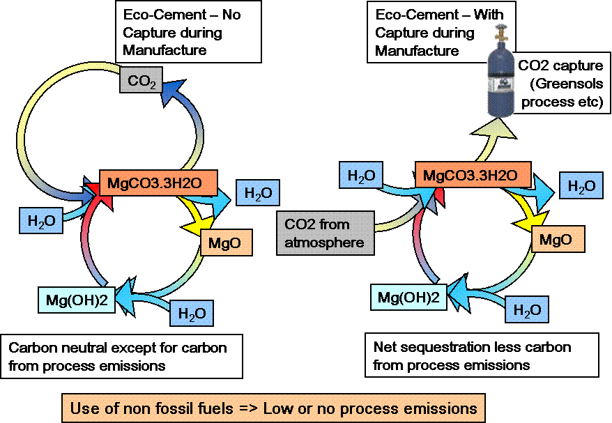 Eco-Cement is either carbon neutral except for process emissions which can be very low if non fossil fuel energy is used or negative (resulting in sequestration) if carbon capture occurs during manufacture as planned by TecEco. Given this production scenario Eco-Cement concretes have the capacity to become a huge carbon sink.